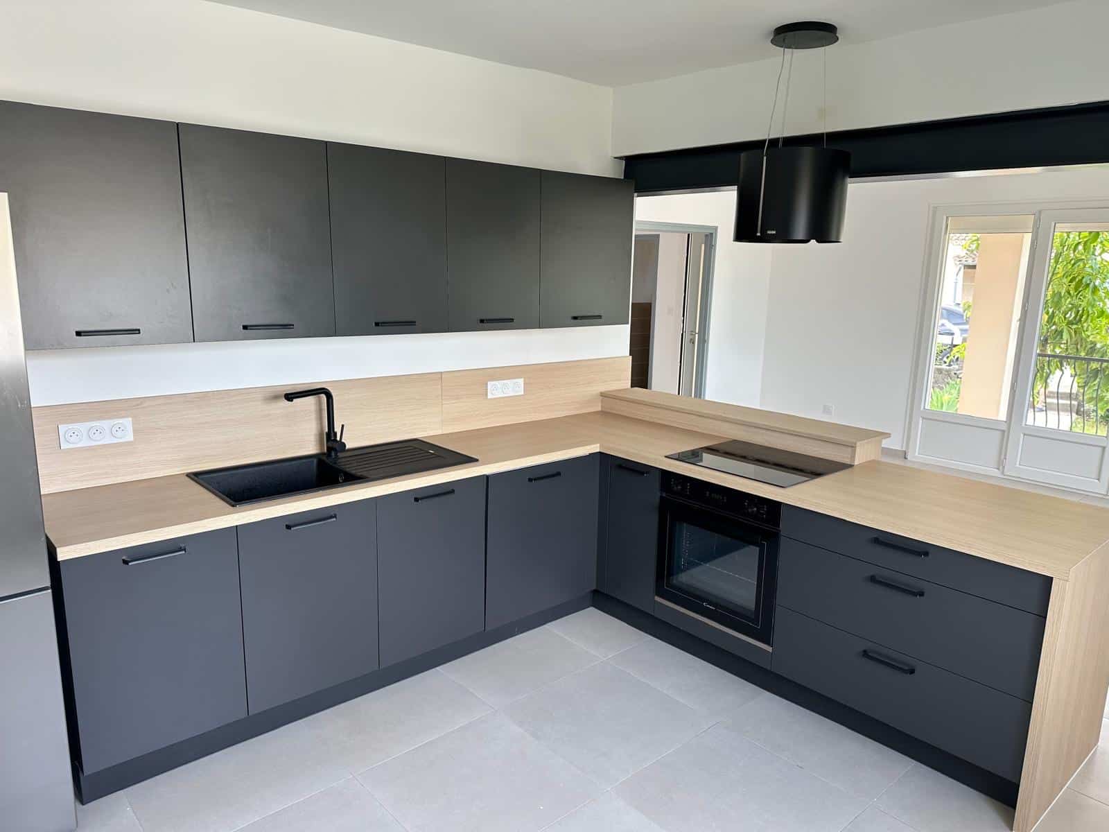 Dans la pièce de vie, nous avons donc ouvert la salle à manger sur le séjour avec la pose d’une poutrelle en acier. Ensuite, nous avons aménagé une grande cuisine ouverte. Notre client a fait le choix d’une cuisine américaine moderne et fonctionnelle avec des meubles noirs et un plan de travail en bois.
