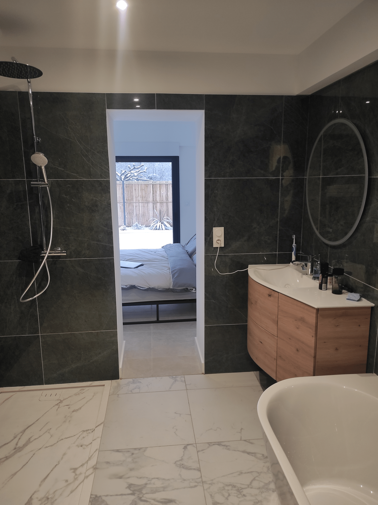 Notre client a fait le choix d’une cuisine ouverte sur la pièce de vie avec un bel îlot central. La chambre parentale, attenante au salon, intègre une large salle de bain, avec une grande douche à l’italienne et une baignoire. Nous avons posé un grand carrelage effet blanc effet marbre au sol et de la faïence noir, rendant cette salle de bain moderne et élégante.