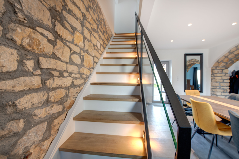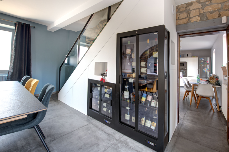 Nous avons conservé et rénové le mur de vieilles pierres sur lequel est adossé l’escalier pour donner du cachet au rez-de-chaussée. L’escalier a été fait sur mesure avec des marches en bois, une rampe en métal noir avec des gardes corps vitrés. Le coffrage sous l’escalier a été conçu pour y intégrer deux caves à vin.