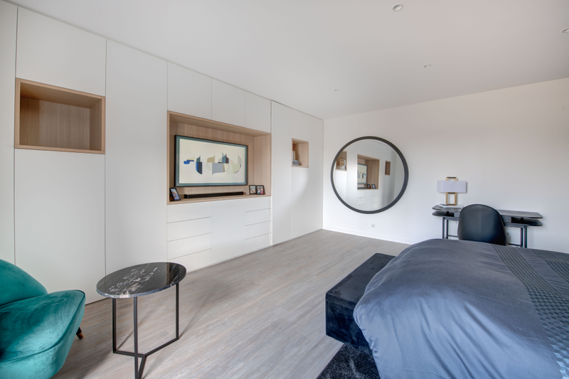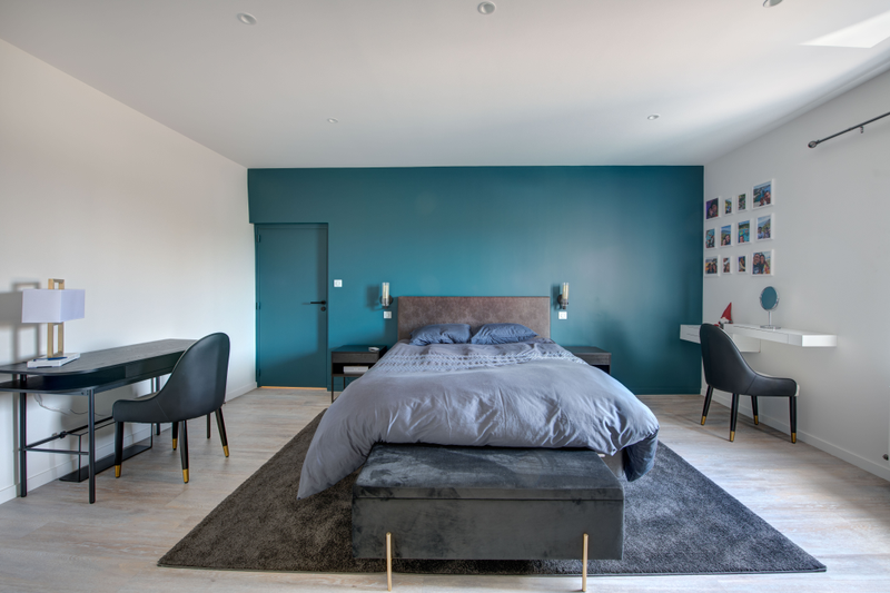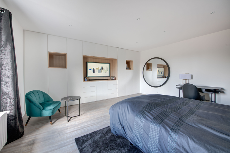 Au-delà du rafraichissement des murs, sol et plafond comme dans les autres pièces de l’étage, la chambre parentale a bénéficié d’un aménagement de rangements sur mesure et de la création d’un dressing.