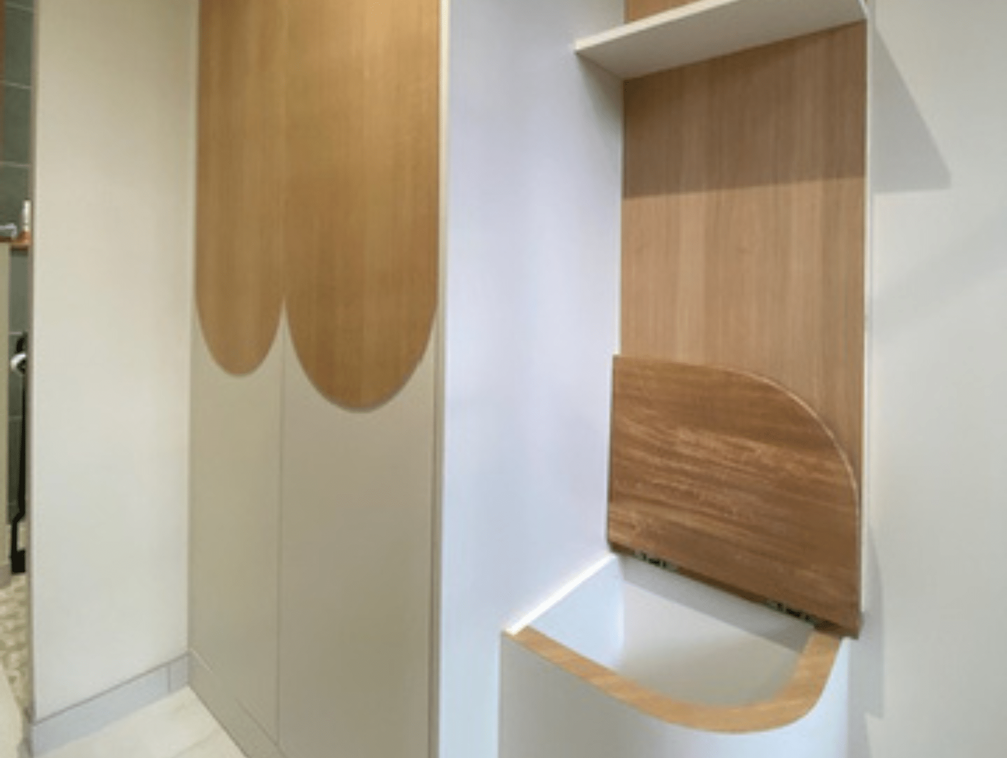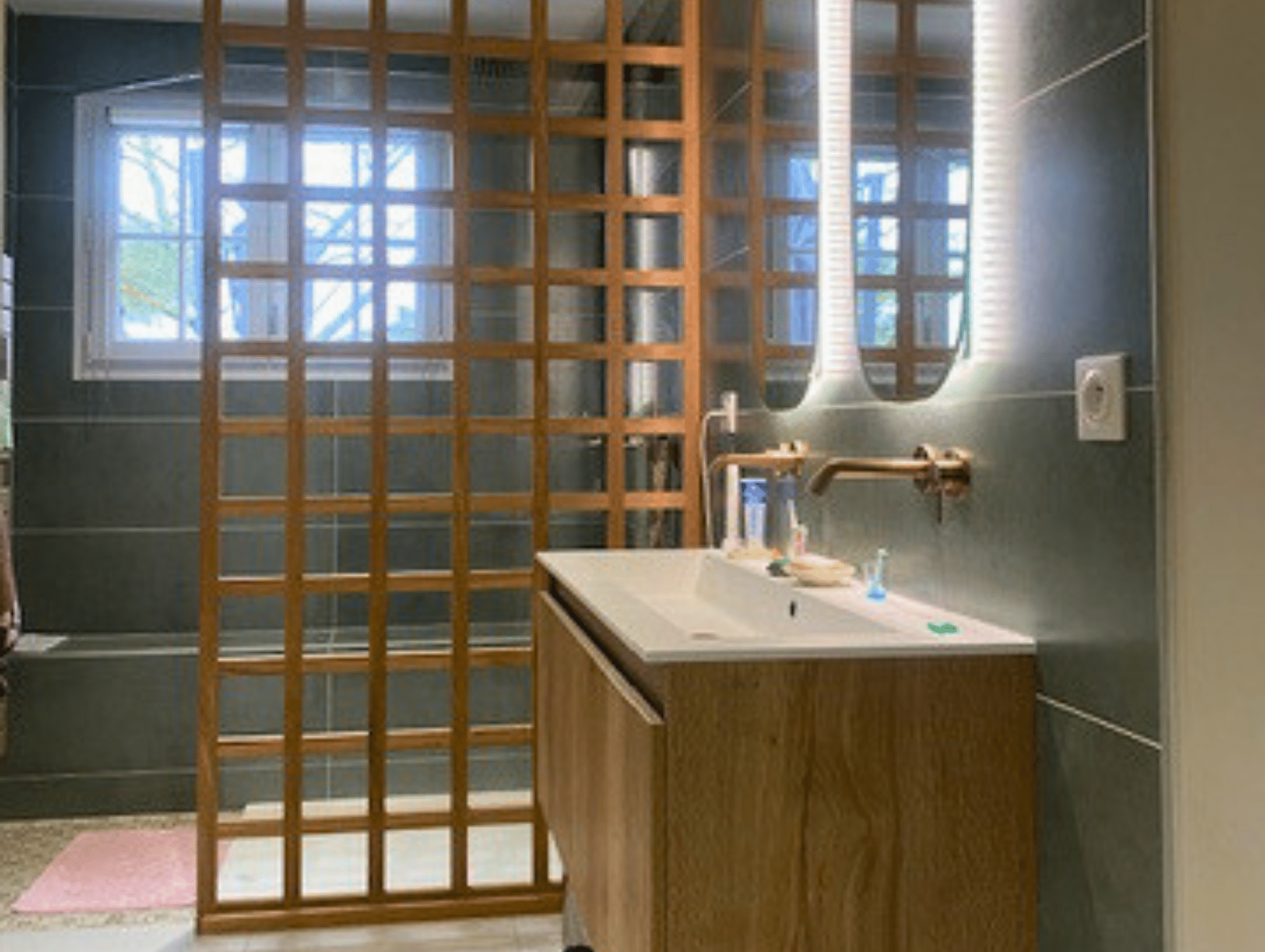 Le peintre a apporté la touche finale sur les surfaces lisses et le menuisier agenceur a réalisé les pièces maîtresses de la décoration. Ce dernier a conçu des placards intégrés aux lignes courbes et posé des claustras en bois sur mesure, qui servent de paroi de séparation élégante tout en laissant circuler la lumière naturelle, parachevant ainsi cette ambiance zen et chaleureuse.