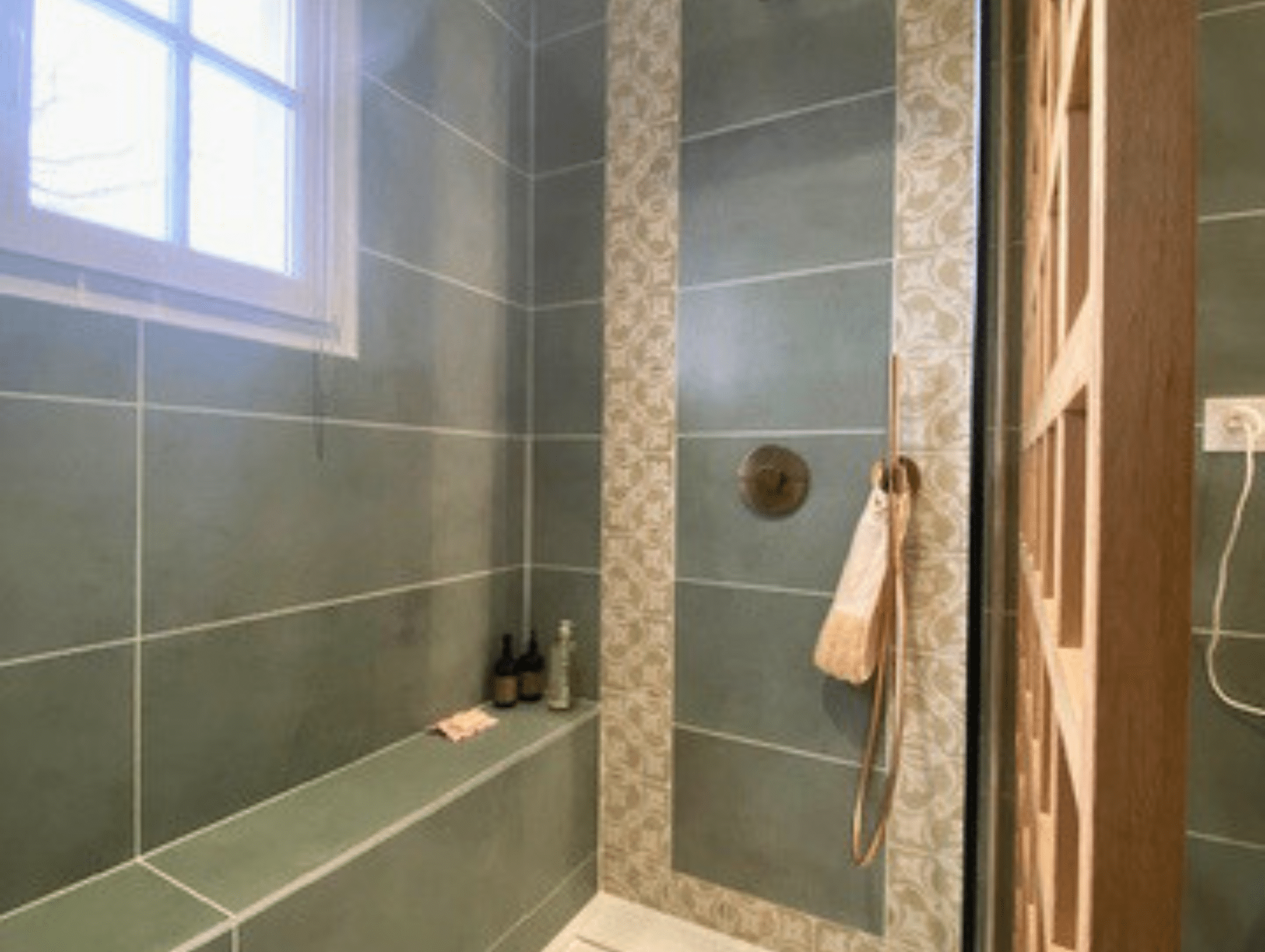 Le carreleur a posé de larges dalles gris anthracite aux murs, contrastant avec une mosaïque plus claire dans la zone de douche.