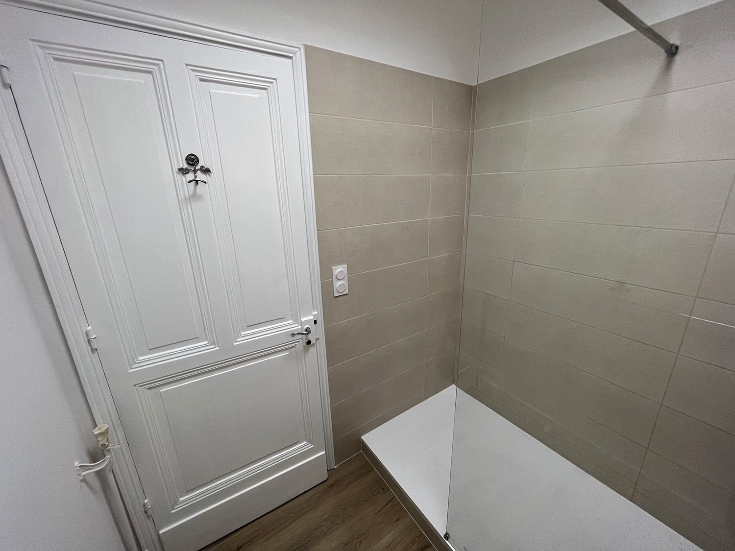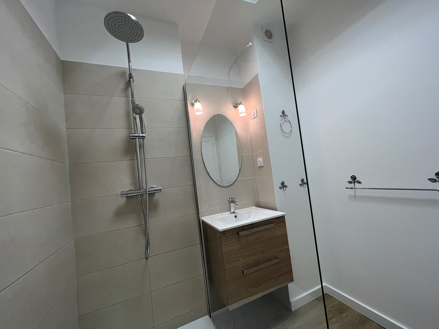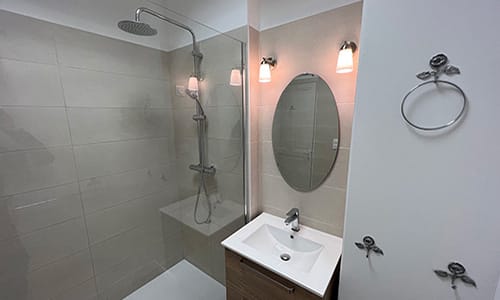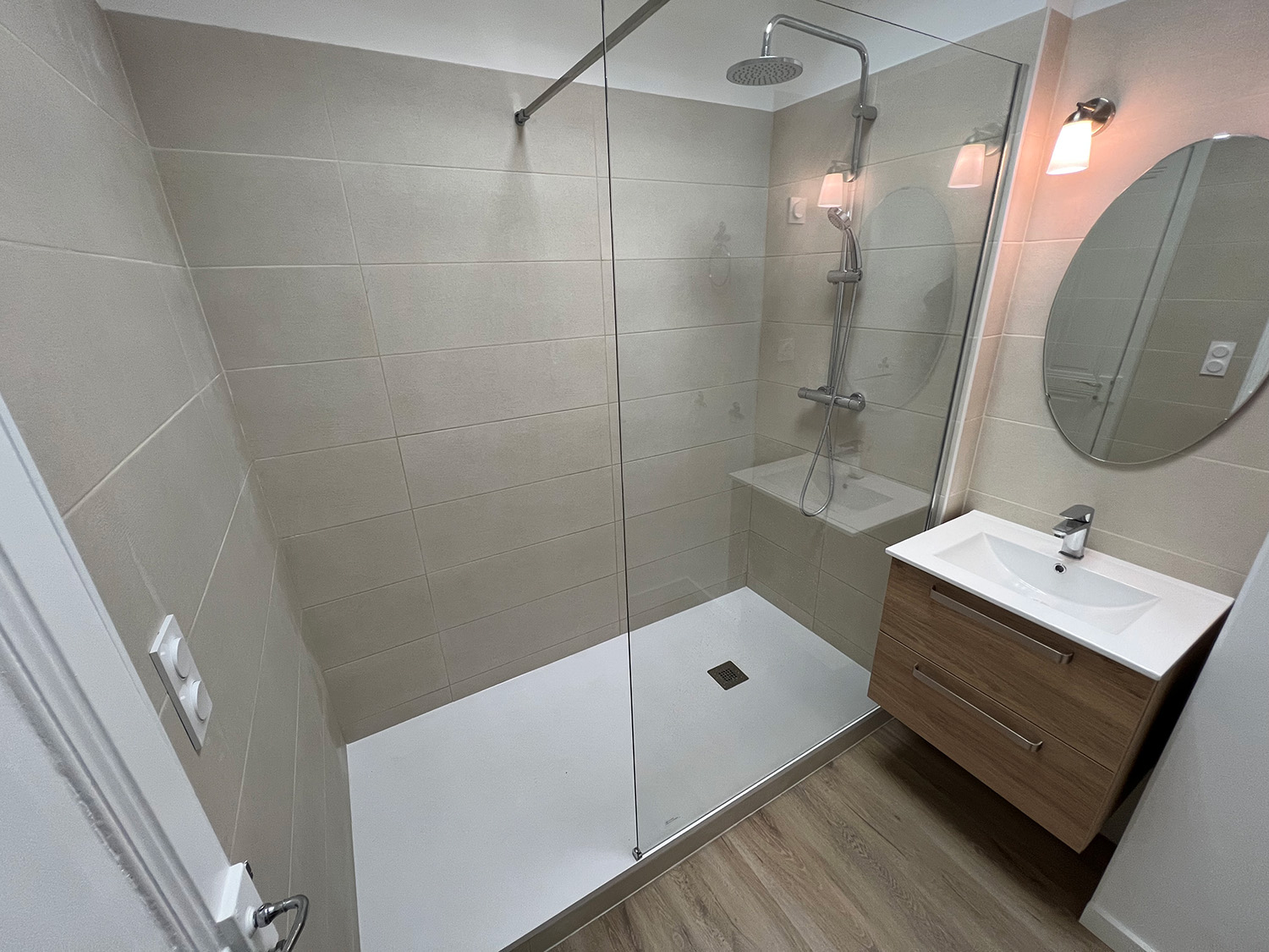 En plus, de l’installation d’une douche, un revêtement de sol PVC, aspect parquet, et des plinthes ont été posées. Ensuite, les peintures des murs, du plafond et de la porte ont été refaites permettant la pose de l’ensemble des fournitures (meuble de salle de bain, miroir, lampes, etc.)