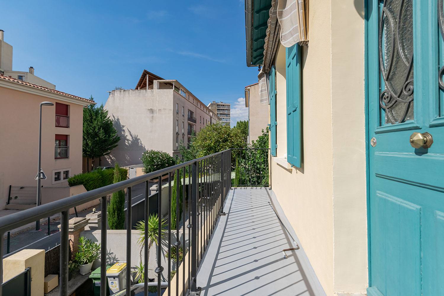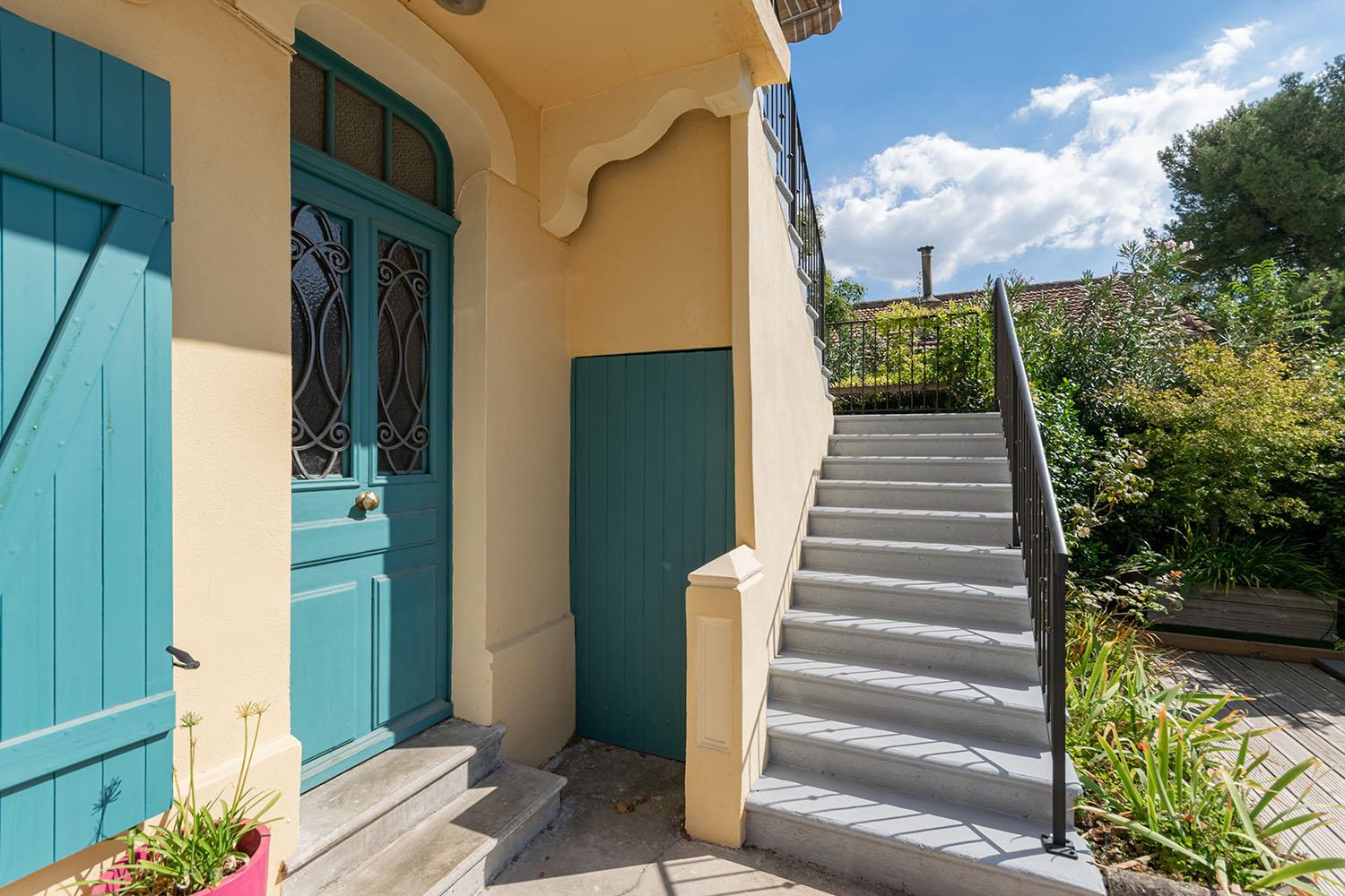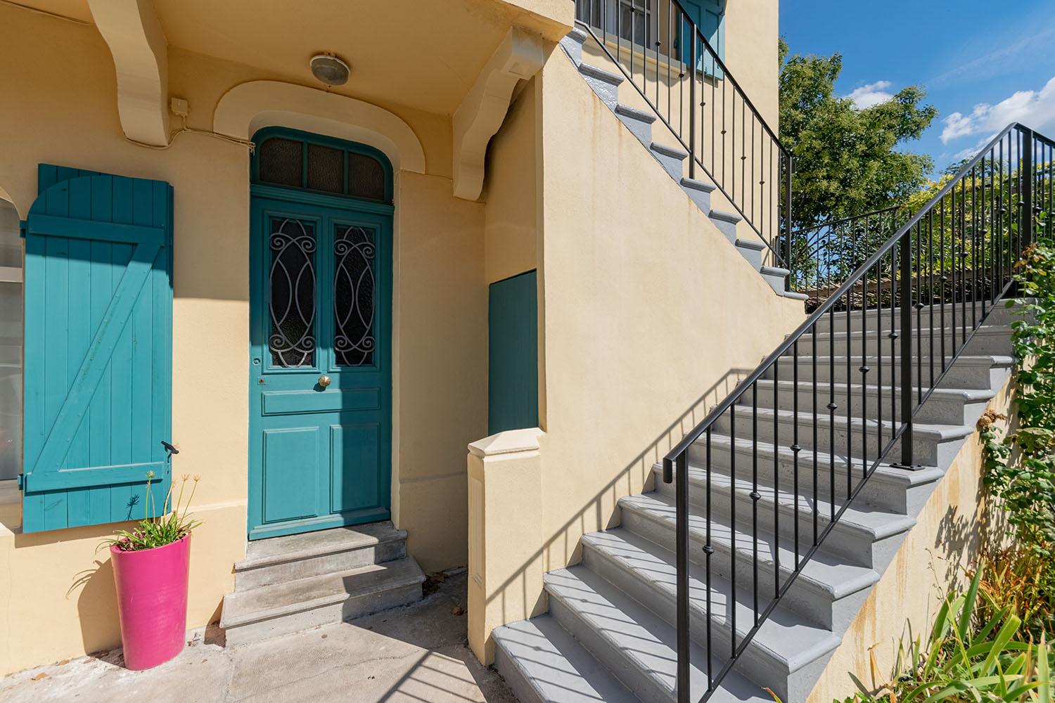 La façade a été entièrement rénovée, offrant un aspect rafraîchi et harmonieux. Les volets ont été repeints en bleu, ajoutant une touche de couleur vive qui contraste élégamment avec le reste de la maison et rehausse son charme provençal.