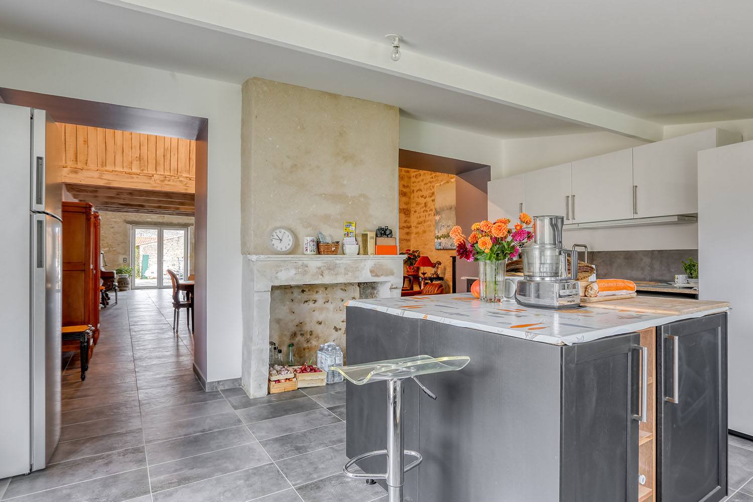 La cuisine a été complètement refaite, avec l’installation d’un îlot central, créant un espace convivial et fonctionnel.