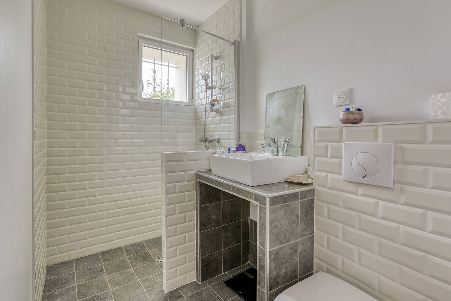 La salle de bain a également été modernisée, avec la création d’une douche à l’italienne et la pose de faïence, apportant une touche contemporaine et élégante.