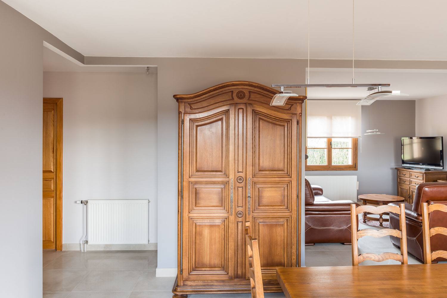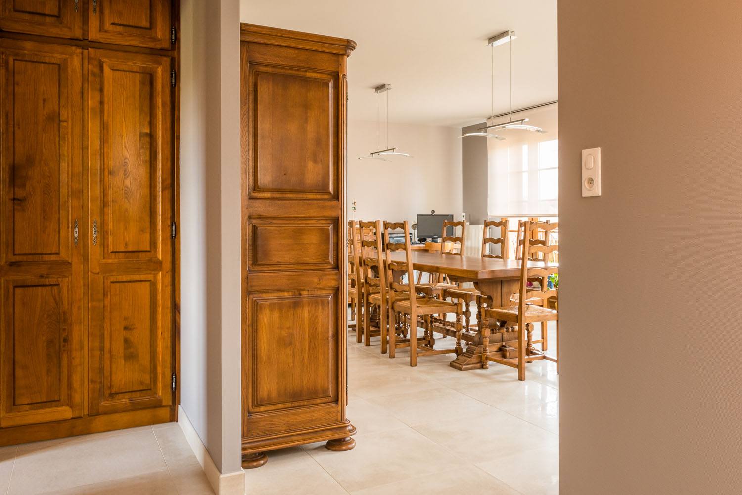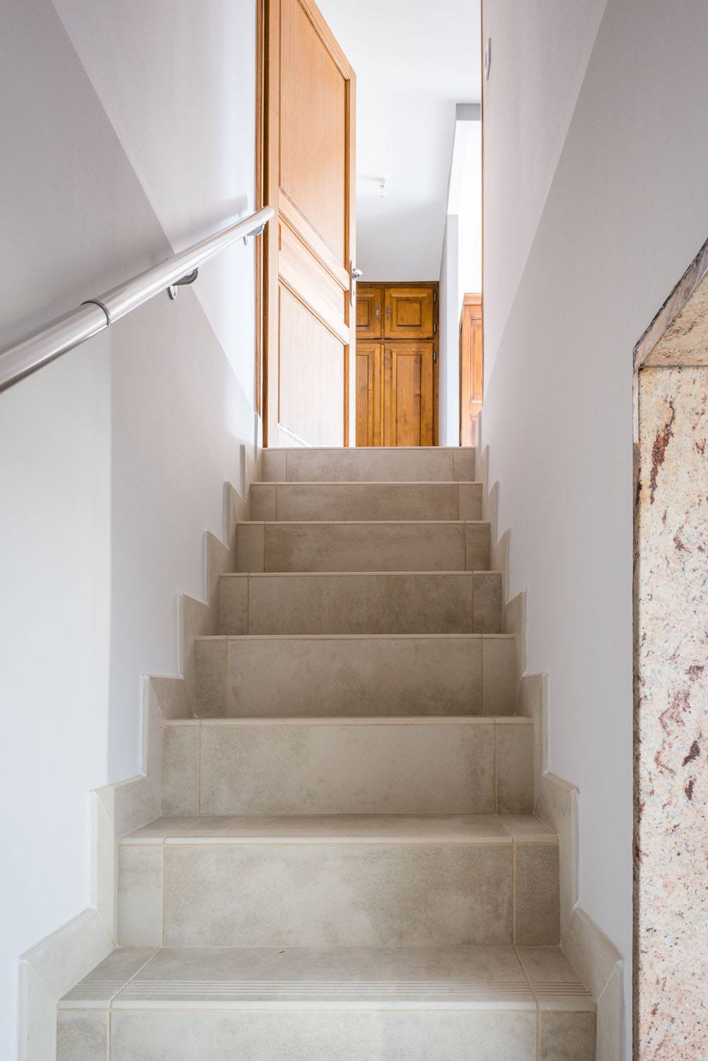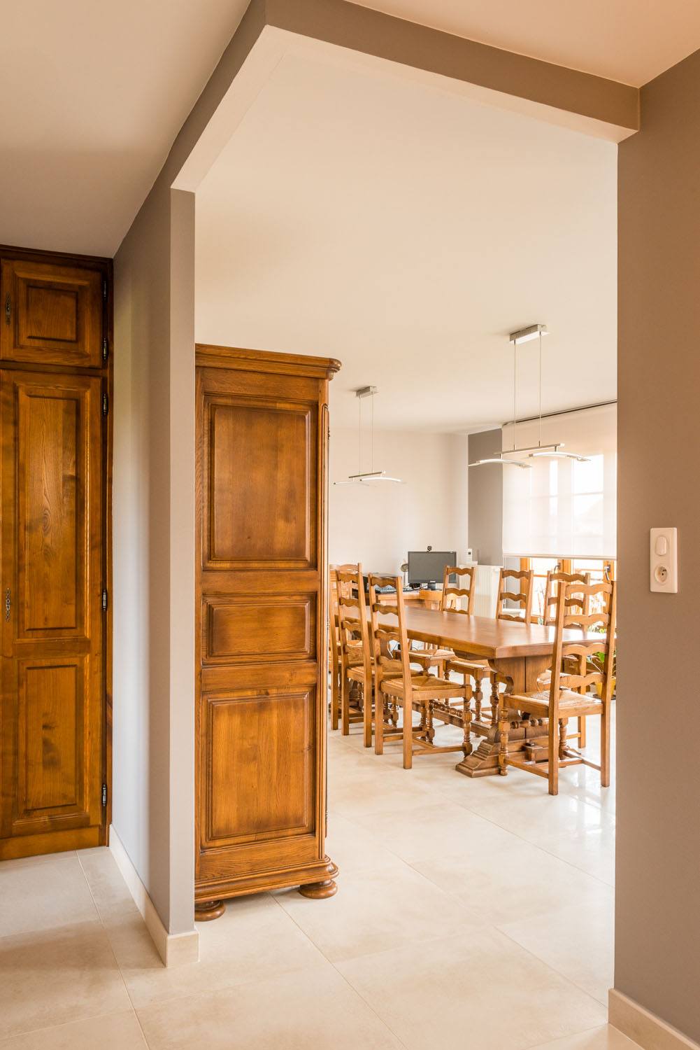 Nous avons également procédé à la rénovation complète des revêtements muraux et des sols. Initialement mixtes (parquet et carrelage) et très sombres, ces derniers ont été unifiés par la pose de grands carreaux. Les murs ont été enduits et peints dans les tons de grège contrastés suivant l’exposition des pans de murs, à la lumière.
