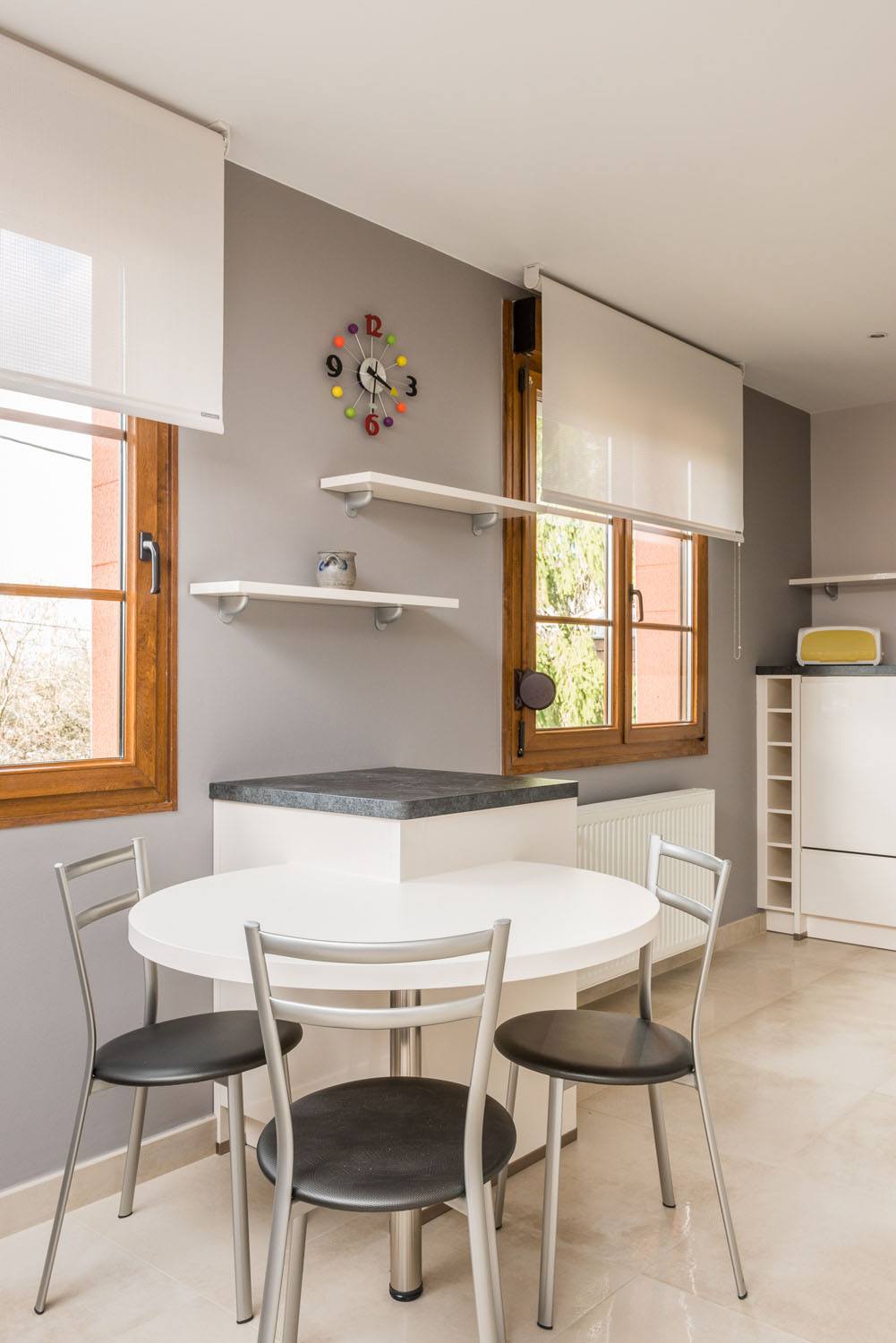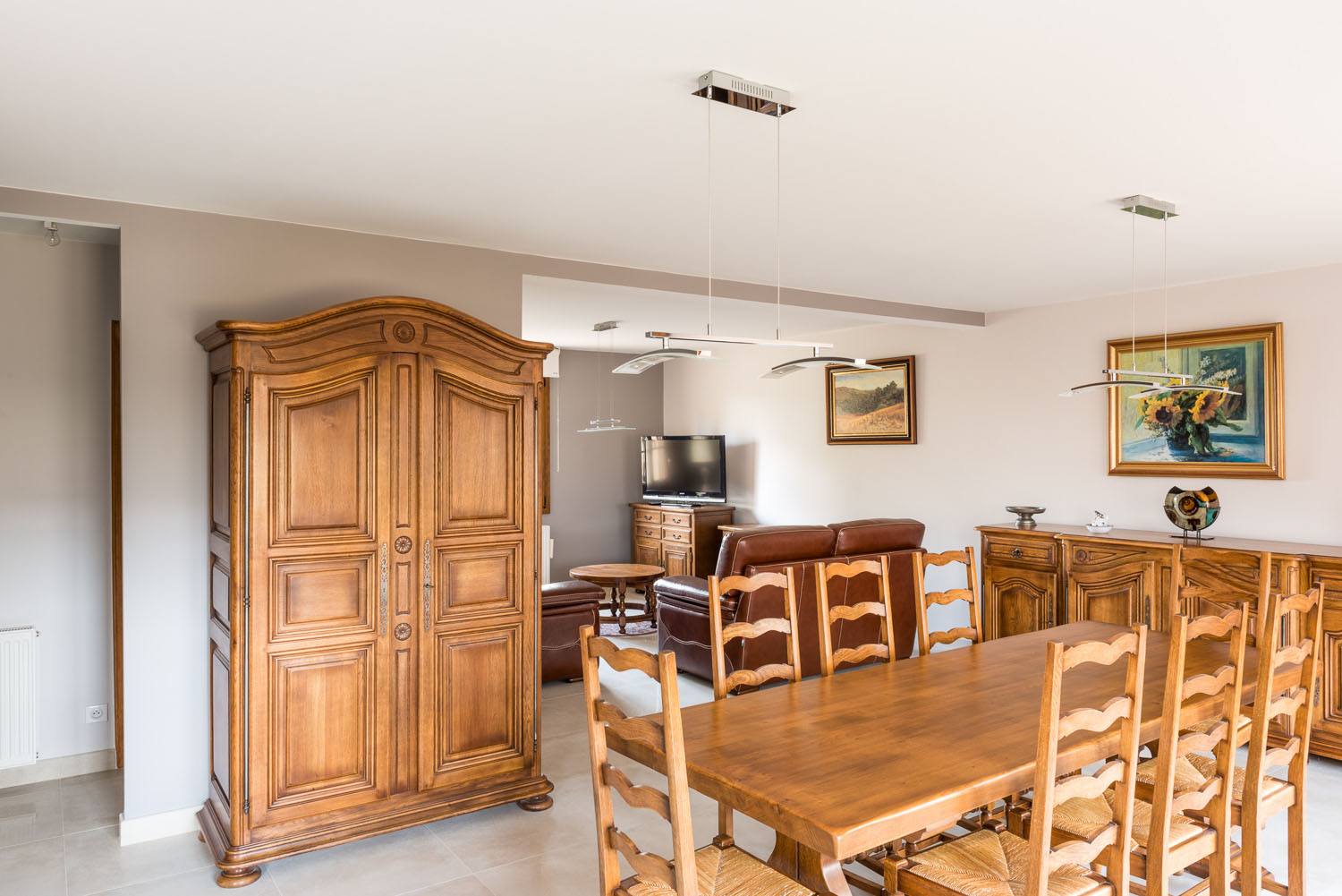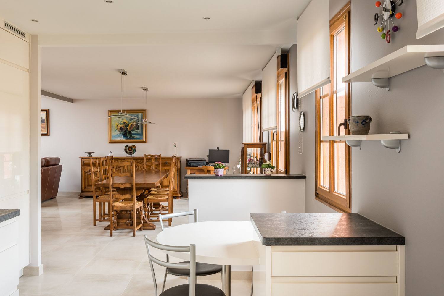 La salle à manger ainsi ouverte sur la cuisine a été agrandie. Les plafonds suspendus en plaques de plâtre ont été remis à niveau après démolition des cloisons.