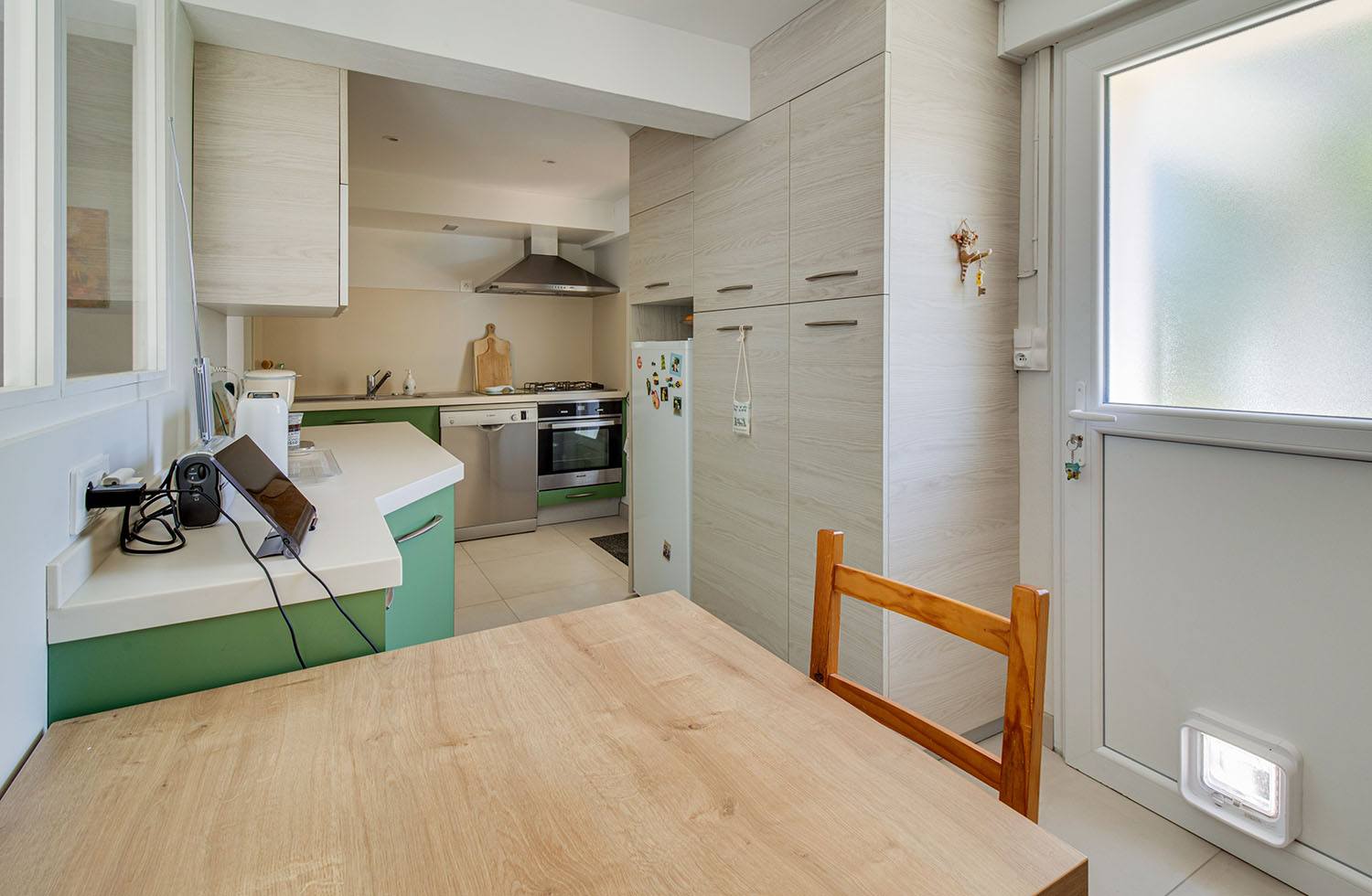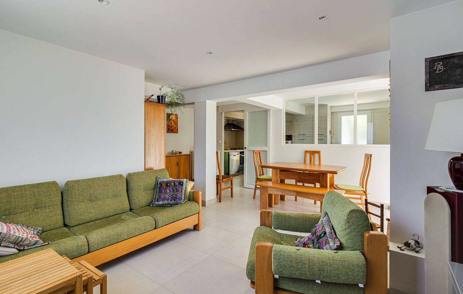 L’ensemble du rez-de-chaussée a été repensé. Les pièces qui ont été impactées par ces travaux de rénovation intérieure sont la cuisine/salle à manger, les chambres, la salle de bain et le bureau.