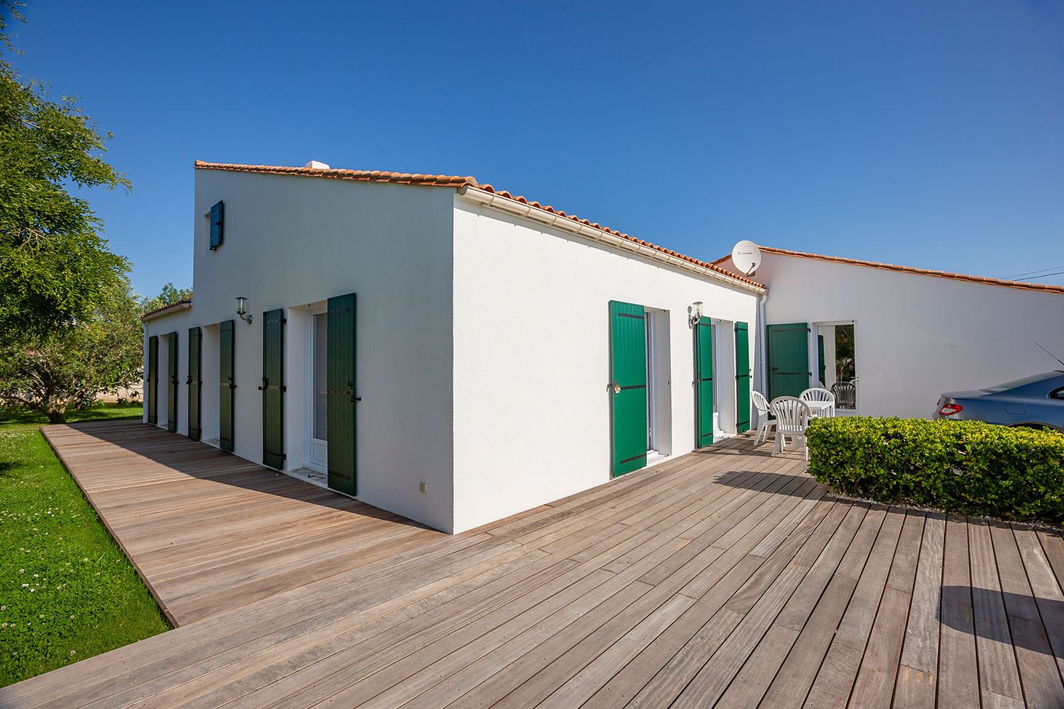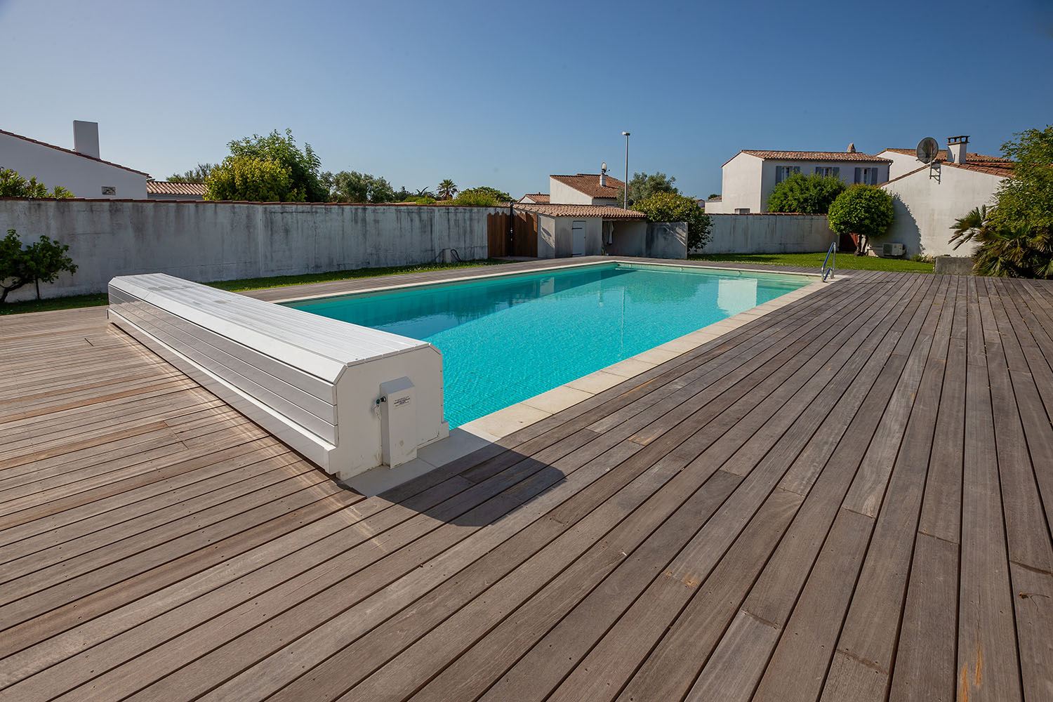 À l’extérieur, une terrasse en bois a été créée autour de la piscine, offrant un espace élégant et pratique pour profiter du climat local.