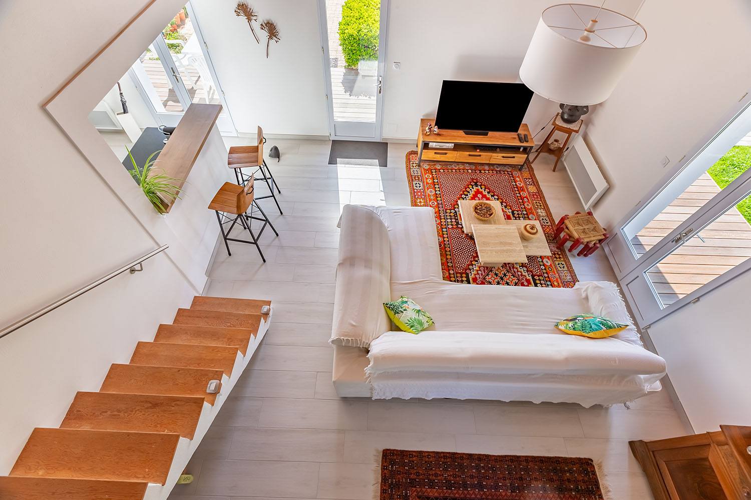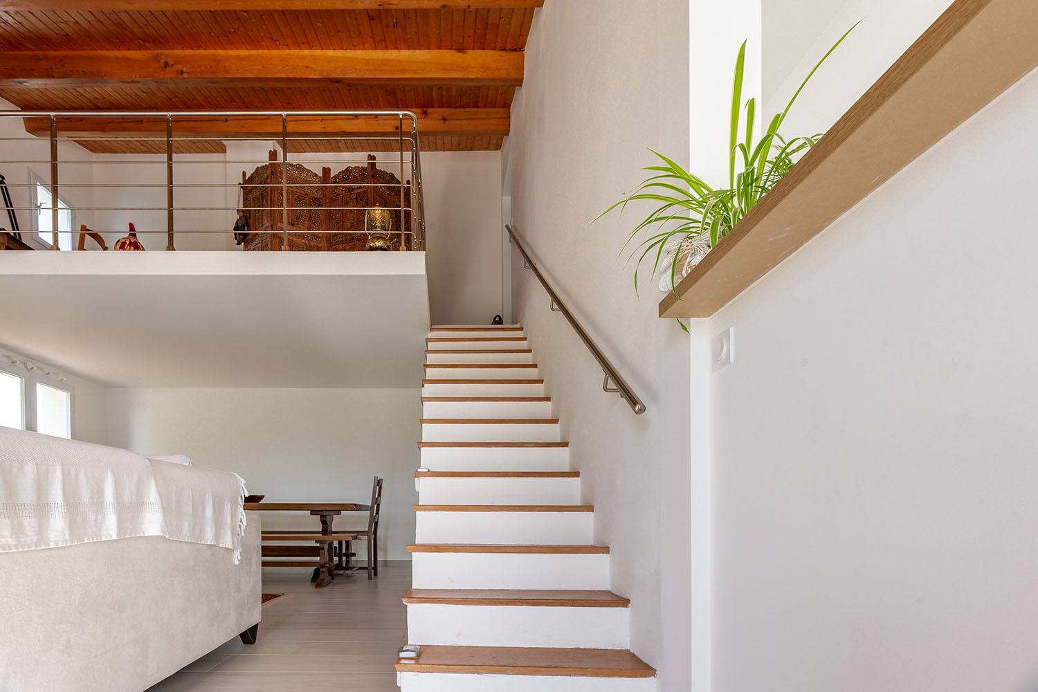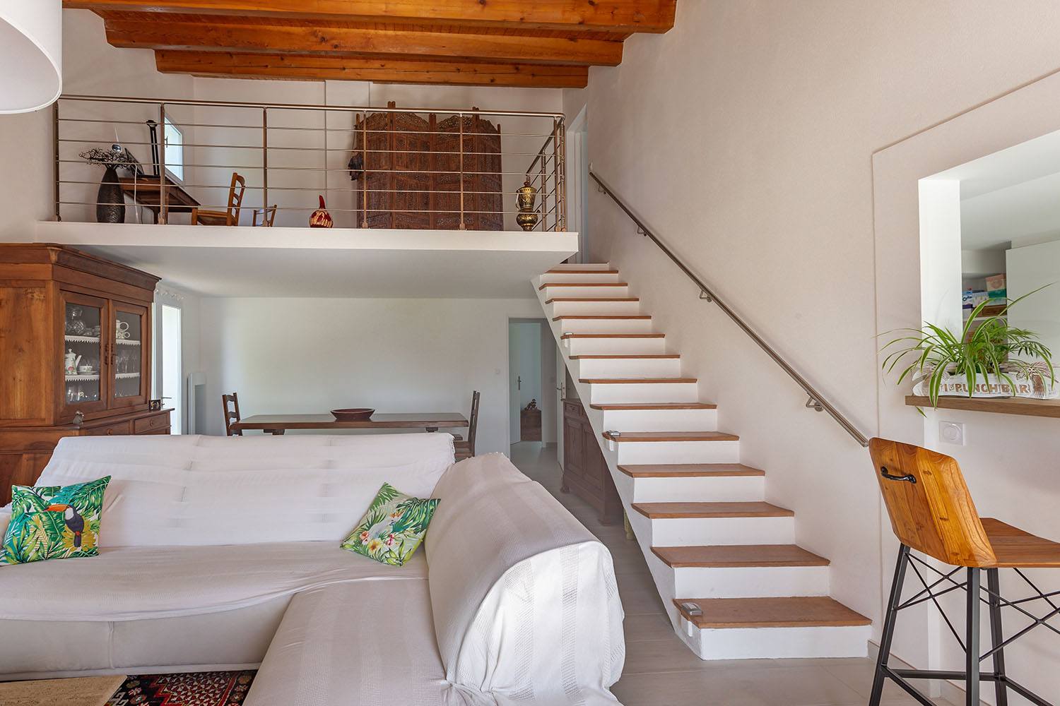À l’intérieur, l’aménagement a été optimisé avec la création d’un espace mezzanine, ajoutant une dimension supplémentaire à la maison.