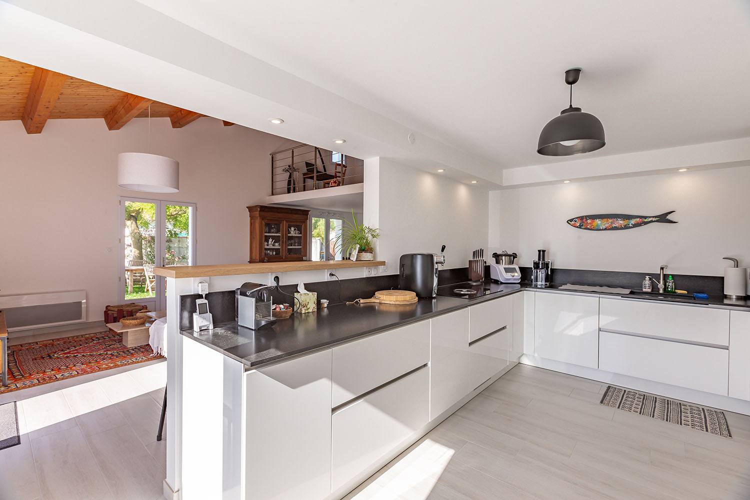 De plus, la cuisine a été ouverte sur la pièce de vie, intégrant un bar pour favoriser la convivialité et la fluidité des espaces.