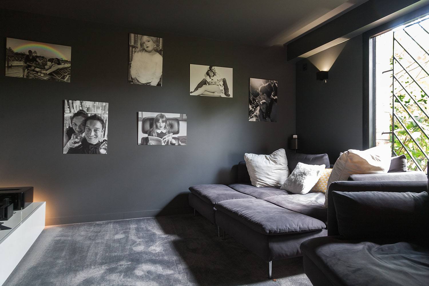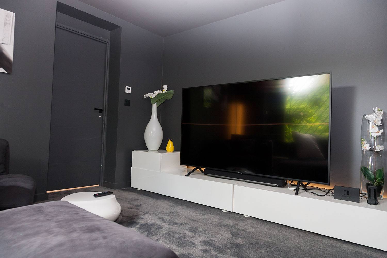 Le salon a été entièrement repensé dans un style résolument contemporain. Les anciennes finitions ont été déposées pour laisser place à un nouvel agencement plus fluide, avec des couleurs claires et des matériaux modernes. Ce nouvel espace de vie a gagné en convivialité et en clarté, tout en conservant des zones distinctes pour chaque usage.