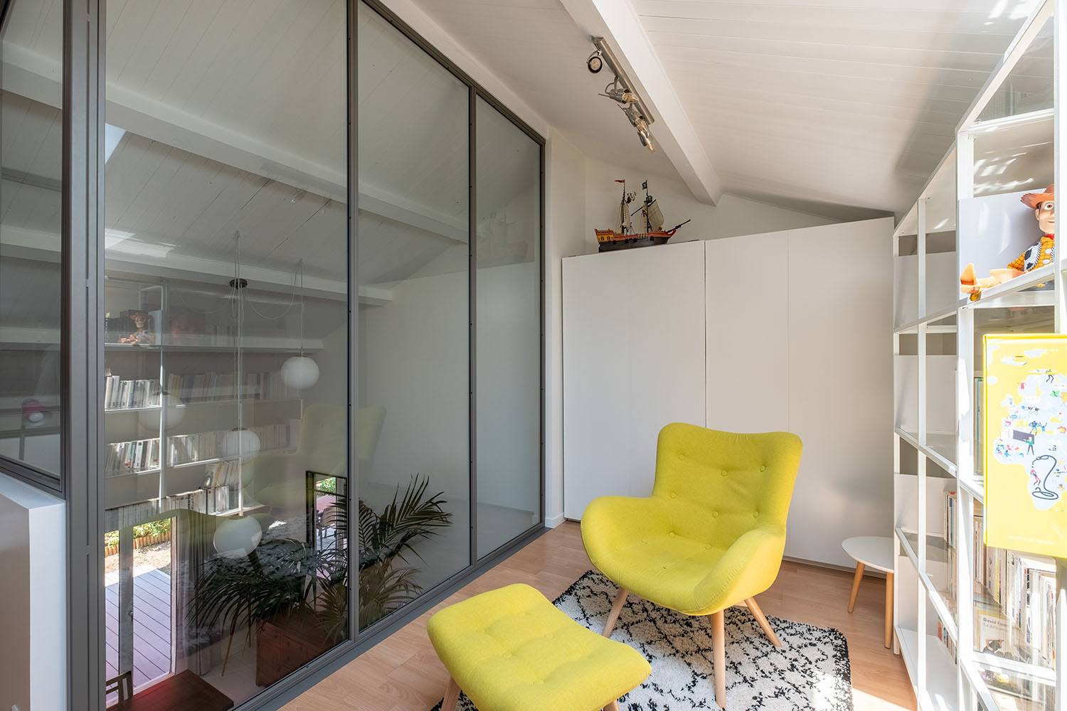 Dans notre maison des années 80, la mezzanine était peu utilisée. Ouverte au-dessus du salon, nous ne savions pas comment investir les mètres carrés de ce palier avec une rambarde classique en bois. Nous rêvions de plus de luminosité dans le salon et d’une salle de jeu fermée à l’étage.