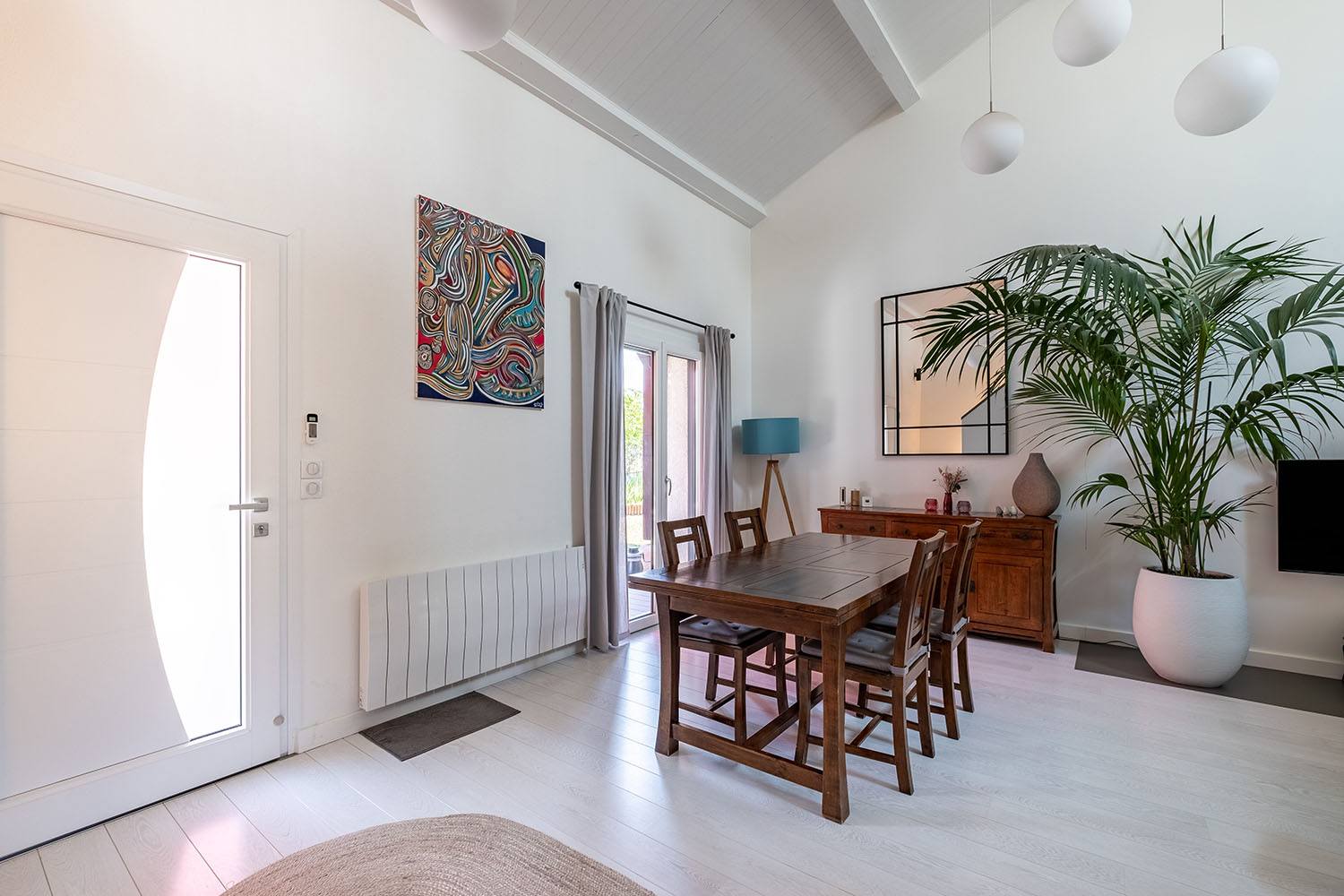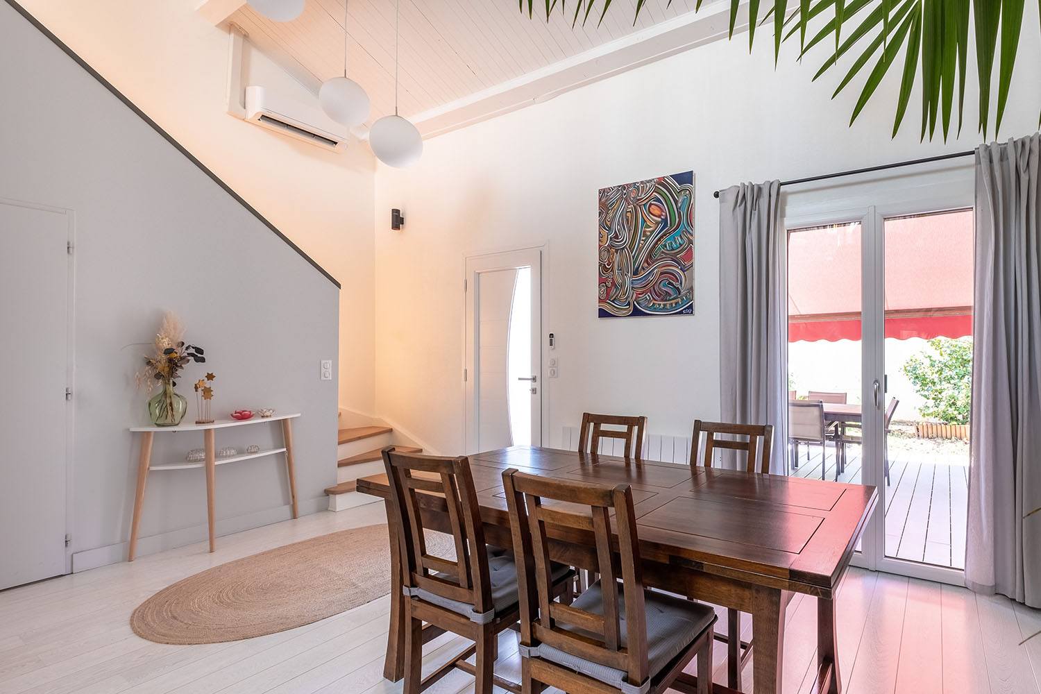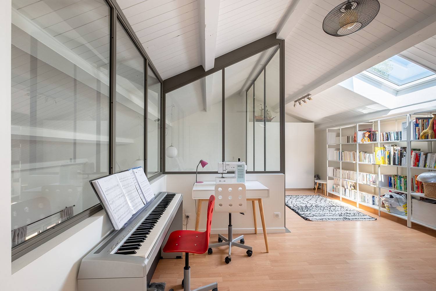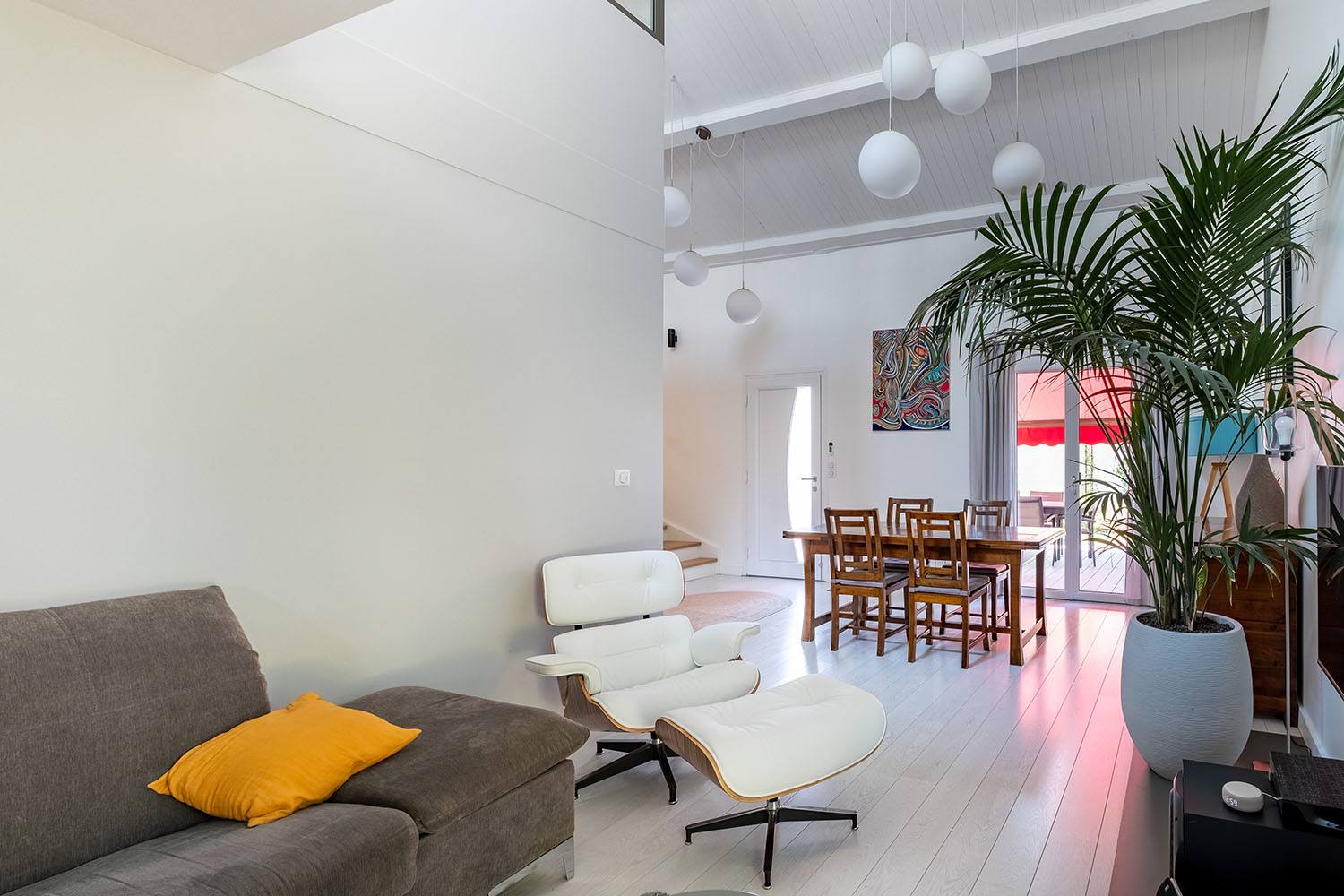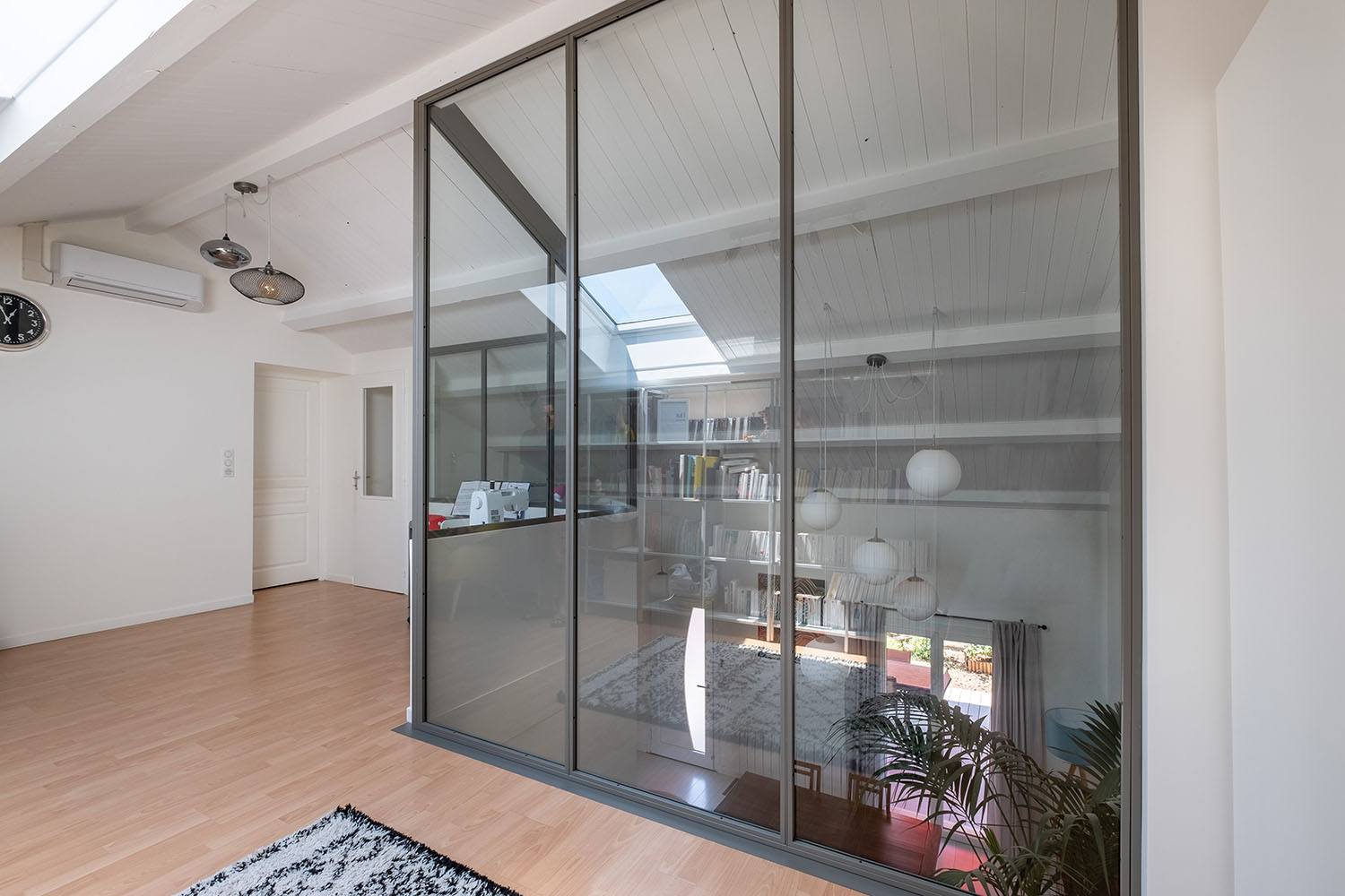 L’ensemble des murs et des plafonds (initialement en lambris couleur bois) ont été repeint en blanc pour apporter de la clarté en intérieur et contribuer à une ambiance contemporaine épurée, recherchée par les clients. Le chantier a été l’opportunité de revoir l’électricité de la maison, d’installer de la domotique et des climatiseurs dans le salon et la mezzanine. Le choix des verrières, style industriel, apporte du cachet à l’ensemble tout en laissant passer généreusement la lumière.