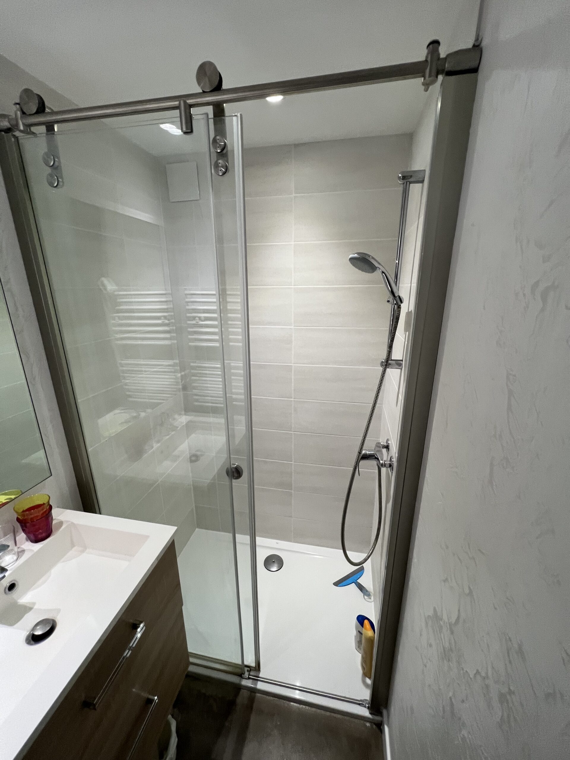 Pour améliorer le confort des étudiants, nous avons commencé par rénover entièrement la salle de bain, avec une nouvelle étanchéité et la pose de faïence moderne. Ensuite, une ouverture a été créée entre la chambre et le coin cuisine, permettant un accès direct plus pratique. Afin de délimiter la cuisine du garage, nous avons installé une cloison partielle avec une verrière en bout de pièce, pour conserver la lumière naturelle venant du jardin. Un nouveau plan de travail ainsi que des meubles de rangement ont été posés pour rendre la cuisine fonctionnelle. Enfin, un revêtement en LVT a été installé au sol de la cuisine et des WC, et l’installation électrique a été mise aux normes. Au total, nous avons optimisé l’espace de vie de cette partie de la maison en améliorant l’utilisation des mètres carrés disponibles.