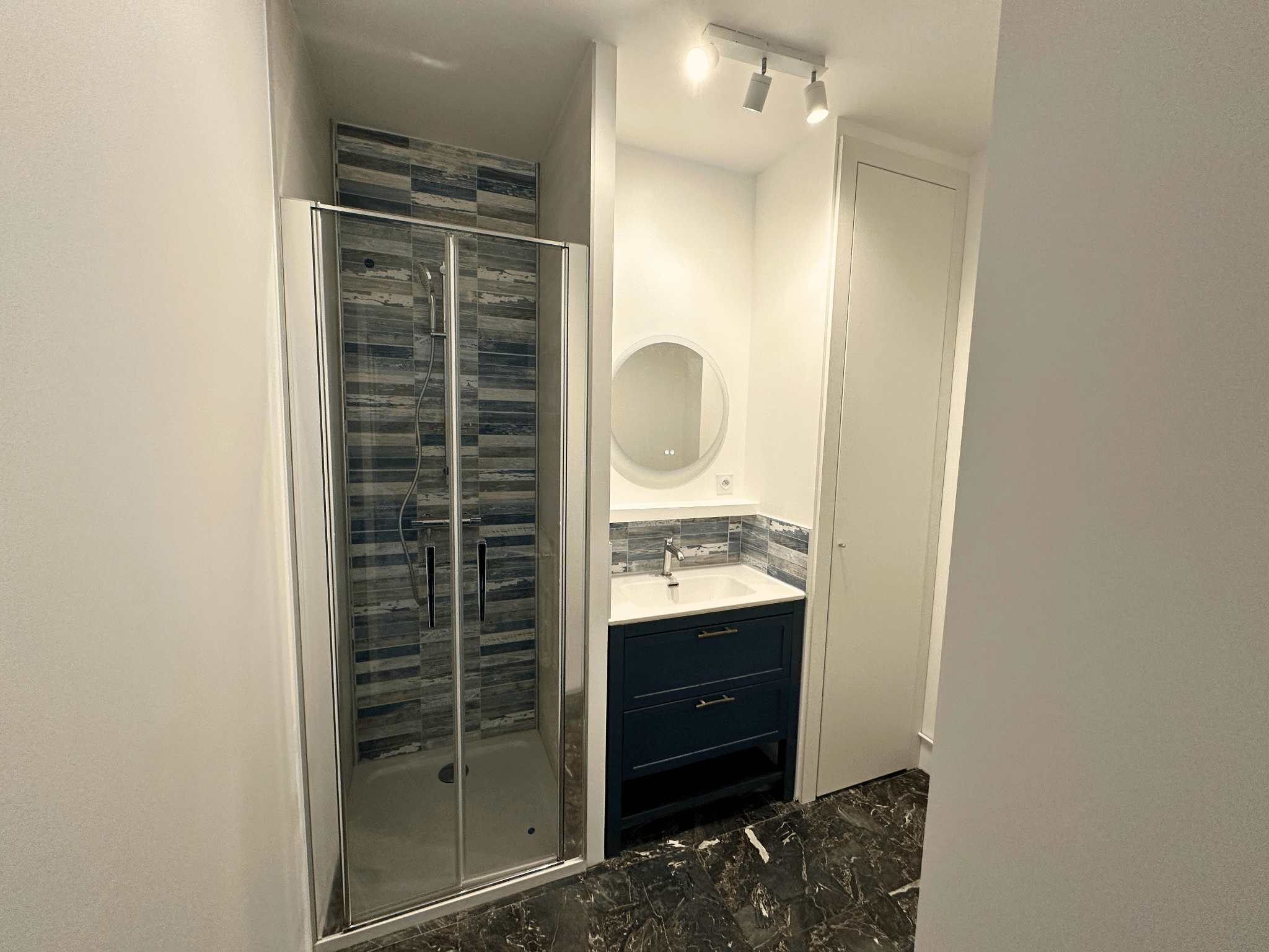 Nous souhaitions remplacer l’ancienne baignoire par une douche, installer un meuble vasque adapté à l’espace réduit et choisir des matériaux durables et esthétiques. C’est pourquoi nous avons fait appel à Vincent Bailly, qui a su nous conseiller et nous rassurer à chaque étape du projet.