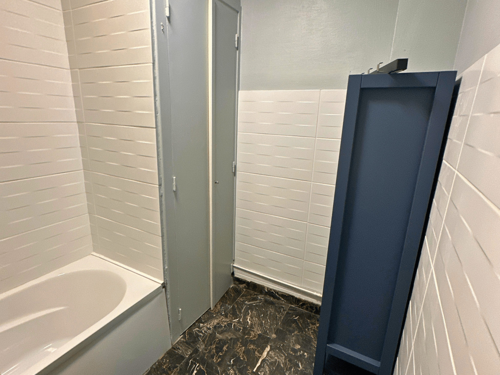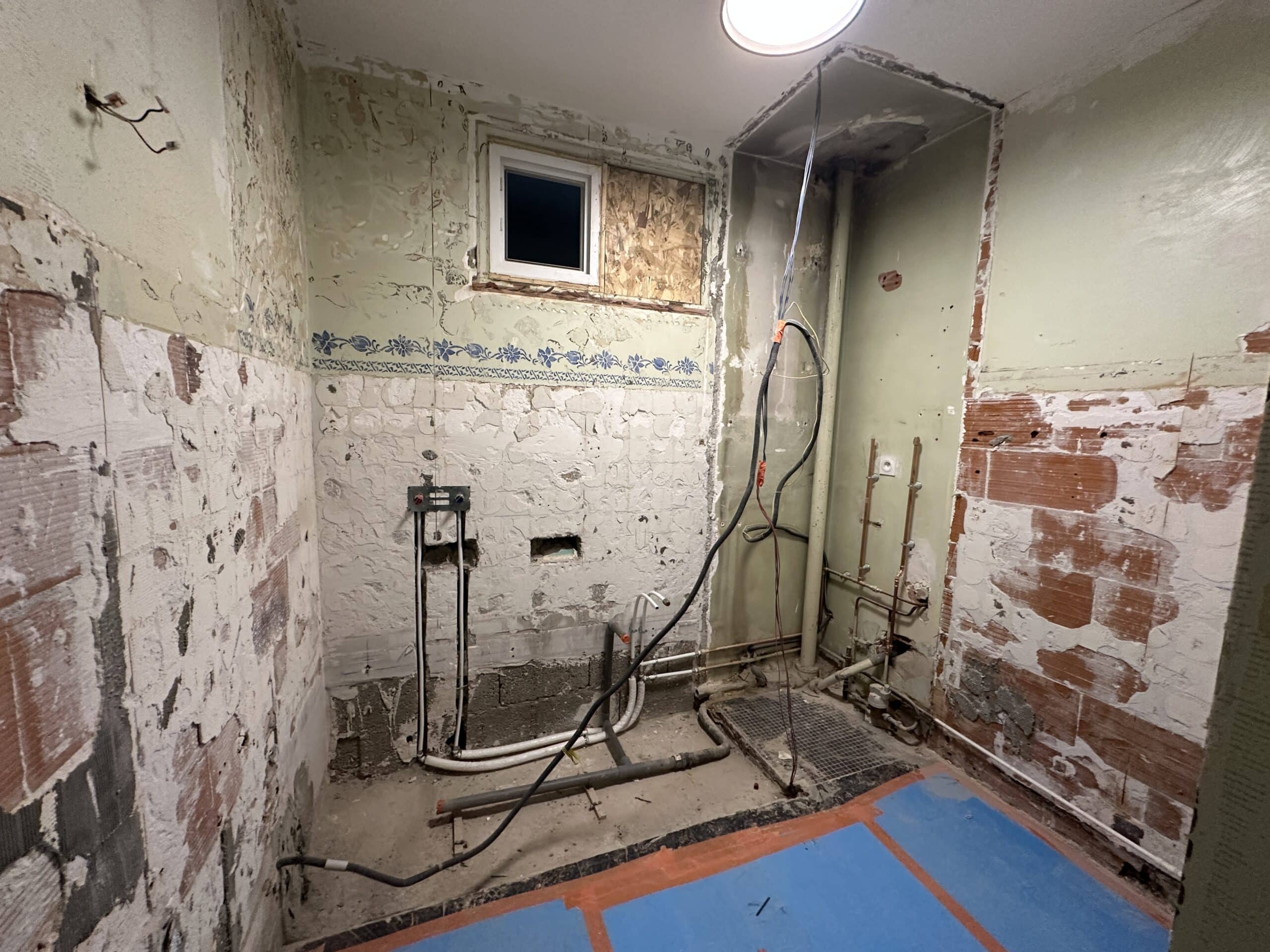 La rénovation de la salle de bain a commencé par la dépose des anciens équipements. L’électricité et la plomberie ont été entièrement reprises pour répondre aux nouvelles normes et permettre l’implantation d’un chauffe-eau gain de place connecté. La baignoire a été remplacée par une douche pratique et compacte. Un meuble vasque adapté à la configuration de la pièce a été installé pour optimiser l’espace disponible.
