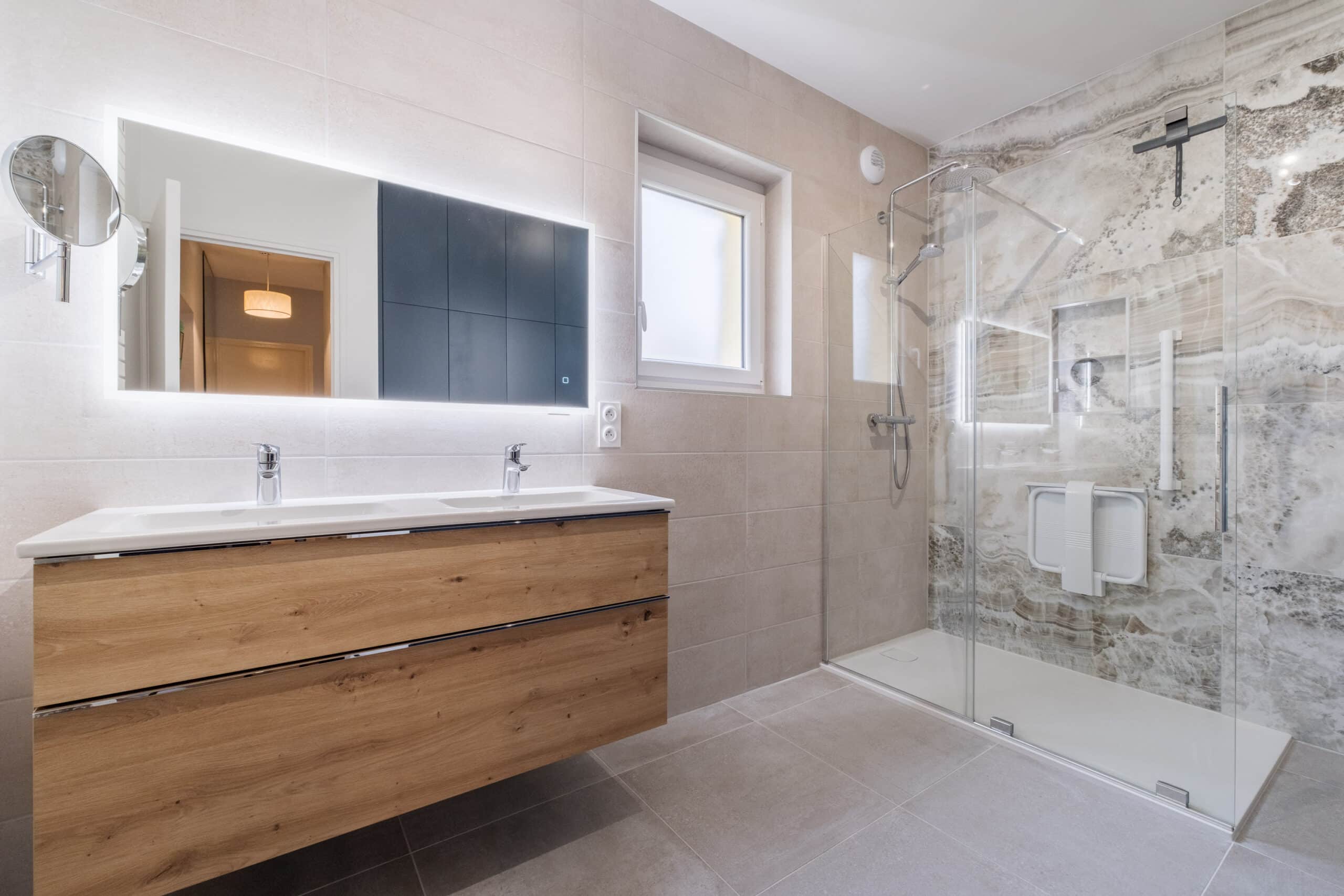Nous avons refait intégralement les réseaux hydrauliques pour alimenter la douche, le meuble vasque et le WC. La baignoire a été remplacée par un receveur de douche extra-plat, facilitant l’accès. Une colonne de douche moderne et une paroi coulissante ont été installées pour un confort optimal. Un meuble double vasque a été mis en place, accompagné d’un second sèche-serviette à eau, raccordé au réseau de la pompe à chaleur pour une performance énergétique améliorée.